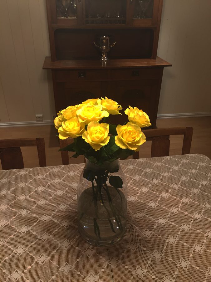 Fredag – fyr på peisen, ferske roser i vårfarger, ro i huset. Knallgult og knallgrønt er de fresheste fargene jeg vet om, og de minner sånn om vår og sommer og varmere tider.