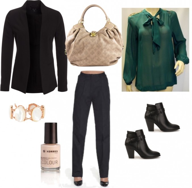 Nuvel, det var vel en avsporing. Jeg elsker fargen på den grønne chiffonblusen som jeg kjøpte på eBay for en slikk og ingenting – de gullgreiene på skuldrene sprettet jeg bare av. På den annen side krympet den litt i vask, så nå er dere advart om det. Og jeg fant ikke helt maken til perlemorsarmbåndet mitt på nett, men jeg fant et som ligner ganske mye. Korres-neglelakken er kjøpt på Vita, men det ser ikke ut til at de har den fargen inne lenger nå. Pastel Peach heter den og har overraskende god dekkevne til å være så lys som den er.